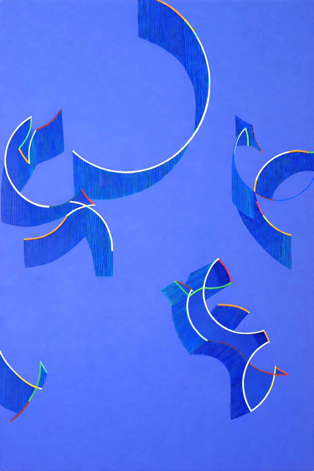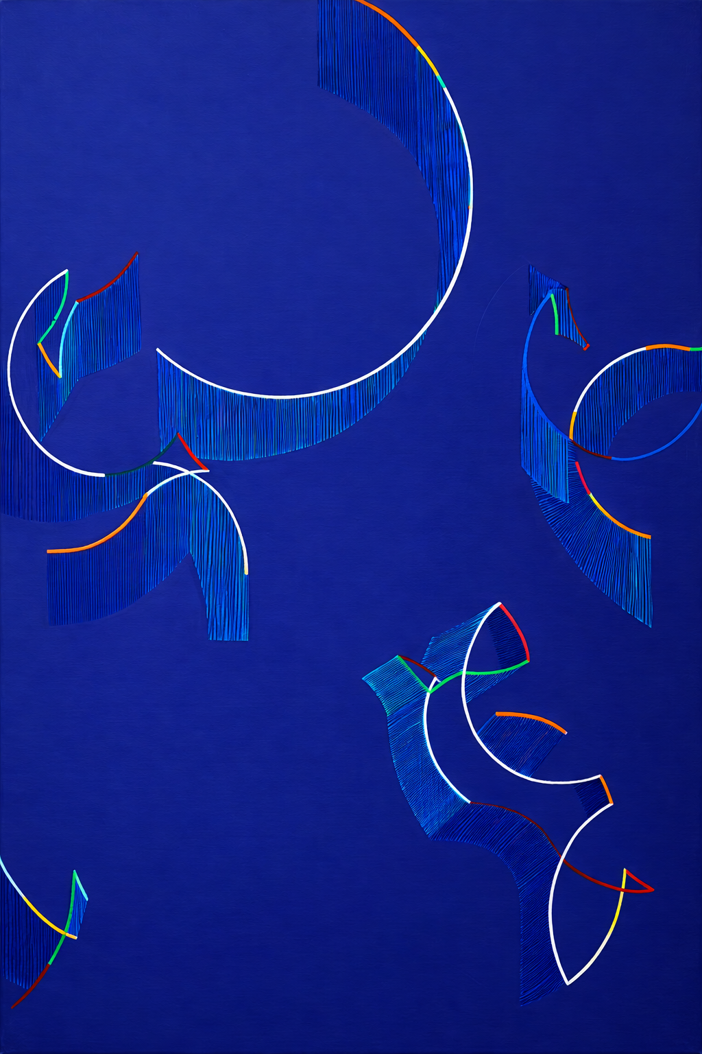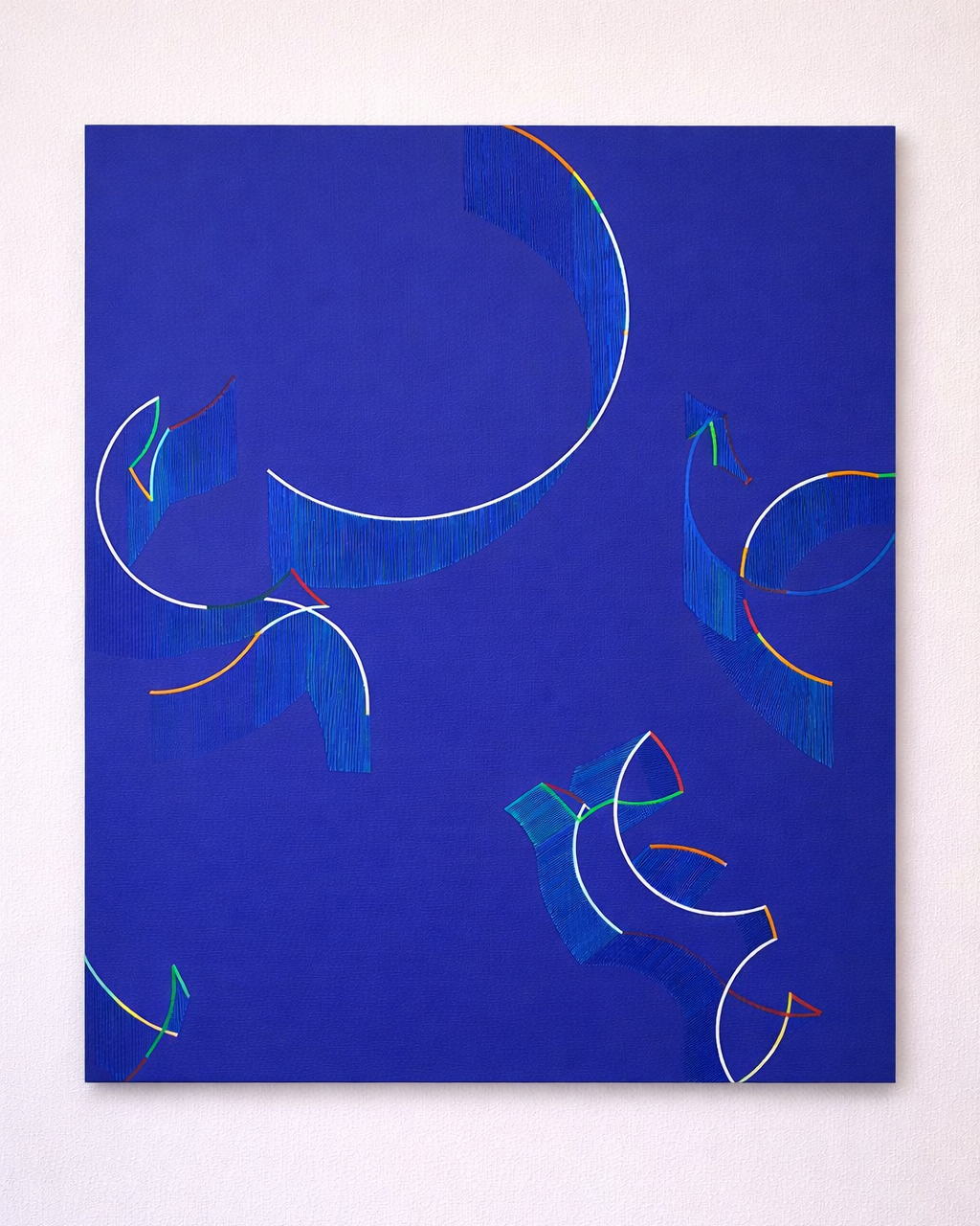Modrý abstraktní obraz je inspirován dynamikou tanečních kroků lidových moravských písní, jejich rytmem, energií a vzájemným prolínáním pohybů. Kompozice vychází z pohledu shora na taneční parket, kde se jednotlivé trajektorie setkávají, kříží a rozcházejí. Tenké barevné linie představují samotné kroky nebo stopy pohybu tanečníků zachycené v čase. Překrývající se plochy a jemná struktura malby vytvářejí dojem pulzujícího prostoru, ve kterém se rytmus hudby proměňuje v obrazovou kompozici.